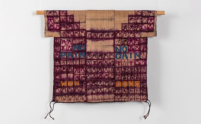 For James Bassler, the inspiration for My Letterman Yantra was an exhibition commission. He was asked by Jack Lenor Larson to create a piece in response to one in George Washington University’s Textile Museum’s collection. Bassler reviewed the museum’s digital images, doubtful that the dotted pixels on his screen, so far removed from their three-dimensional source, would prove inspirational. But he was drawn to an image of a garment from Myanmar (then Burma), a shirt, embellished with yantras, auspicious signs and symbols, associated with cosmic powers that will bring good things to shirt’s wearer. As he is a runner, they reminded him of the race shirts he had been given over the years for participating in marathons, covered with logos and corporate symbols. Why not, he thought, create a 20th-century version? The Letterman Yantra is the result, with woven fabric, and embroidered designs that include rows of running “stick figures,” the number 262 and phrases to speed the imaginary wearer and runner, on. The curator pronounced the reimagined version a great success. Larsen wrote, “The two-sided jacket of James Bassler, with ikat-like patterning, is [ ] exceptional, created with a fugitive-dyed magenta yarn wicking into the adjacent areas. If wicking prints are extremely rare, his patterning of the back side, created by clamping and steaming together the patterned front and the plain back, is a unique and primitive form of transfer printing. Bassler has been successfully sourcing museums with varied and extraordinary results for a long time, and here he seems inspired to create a technique not yet in museums!”