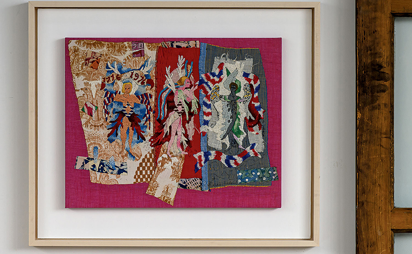 A leading figure in California’s celebrated fiber art community, Katherine Westphal was driven by boundless curiosity and creativity, exploring ceramics, quilting, fiber sculpture, photocopy collage, and wearable art with equal imagination and innovation. “Throughout her career, beginning with the batik samples she made for the commercial printed textile industry in the 1950s, [Westphal] incorporated images from her immediate world: street people in Berkeley, Japanese sculpture, Monet’s garden, Egyptian tourist groups, Chinese embroidery, images from newspaper and magazine photos, and her dogs…anything that struck her fancy wherever she happened to be at the moment – and she could put any or all of them into a repeat pattern. Her wit and whimsy [were] legendary and her lively approach also inspired her husband [Ed Rossbach] to combine imagery onto the surface of his inventive baskets and containers,” wrote Jo Ann C. Staab in 2015 (“Fiber Art Pioneers: Pushing the Pliable Plane,” Retro/Prospective: 25+ Years of Art Textiles and Sculpture, browngrotta arts, Wilton, CT 2015.) Angels captured her interest in 1976 and resulted in the energetic embroidery Bicentennial Angels. The work is well worth a lookback in 2026, America’s semiquincentennial year.